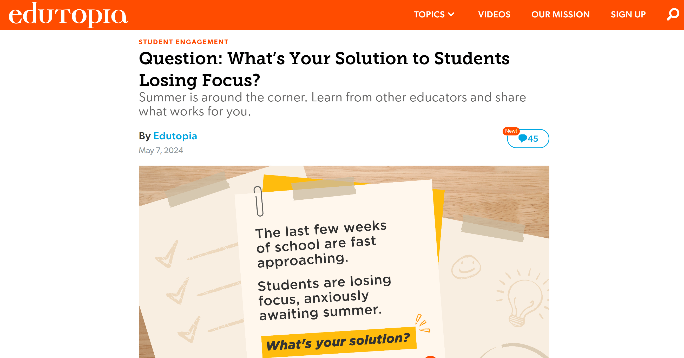 13 05 2024We all know it – spring break is over and summer is around the corner. HOW do we keep our students focused? I saw this article on Edutopia and wanted to share it with you.